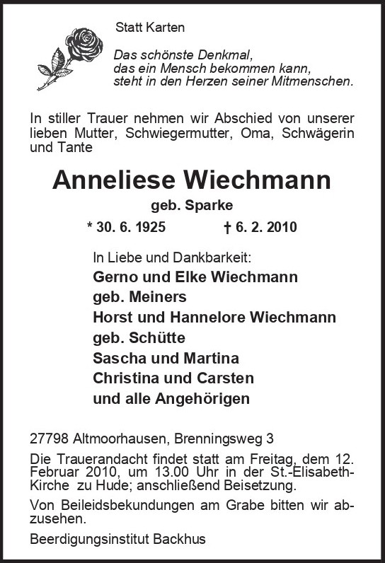Anneliese Wiechmann – Traueranzeige